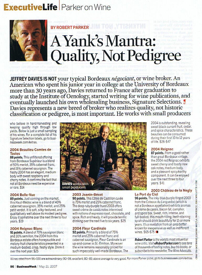 JEFFREY DAVIES IS NOT your typical Bordeaux négociant, or wine broker. An American who spent his junior year in college at the University of Bordeaux more than 30 years ago, Davies returned to France after graduation to study at the Institute of Oenology, started writing for wine publications, and eventually launched his own wholesaling business, Signature Selections. J. Davies represents a new breed of broker who realizes quality, not historic classification or pedigree, is most important. He works with small producers who believe in hand-harvesting and keeping quality high through yields. Below is just a small sampling fo his wines. For a complete list of his Signature Selections labels, go to businessweek.com/extras.